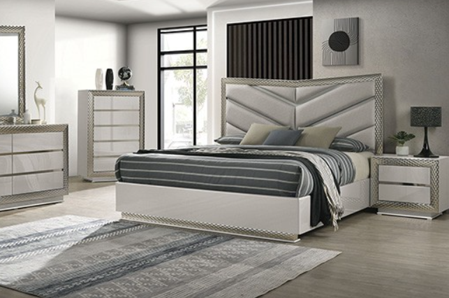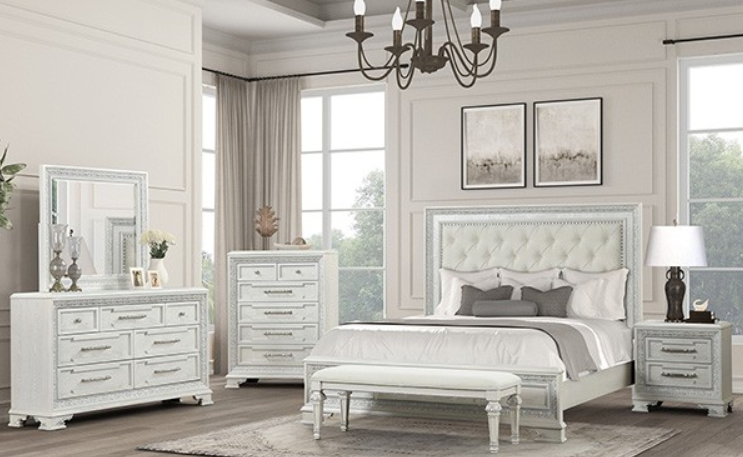 The unique styling of the Luster Collection presents a glamorous option for your bedroom. Embossed faux-wood veneer features a white finish that allows for the acrylic silver glitter fronts of the hidden jewelry drawers to shine. The jewelry drawers feature felt lining to protect your hidden items from wear and tear. The panel headboard features acrylic silver glitter accent banding as well as a silver faux leather channel-padded insert. Polished chrome bar drawer pulls front the drawers providing complementing contrast to the collection’s finish.
