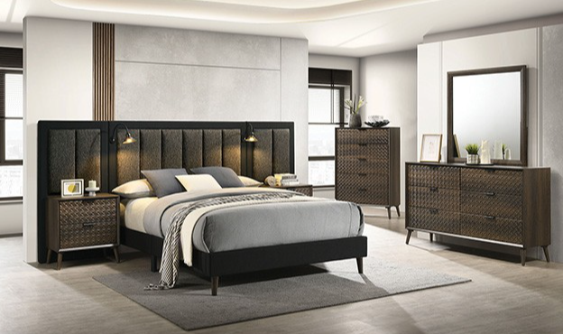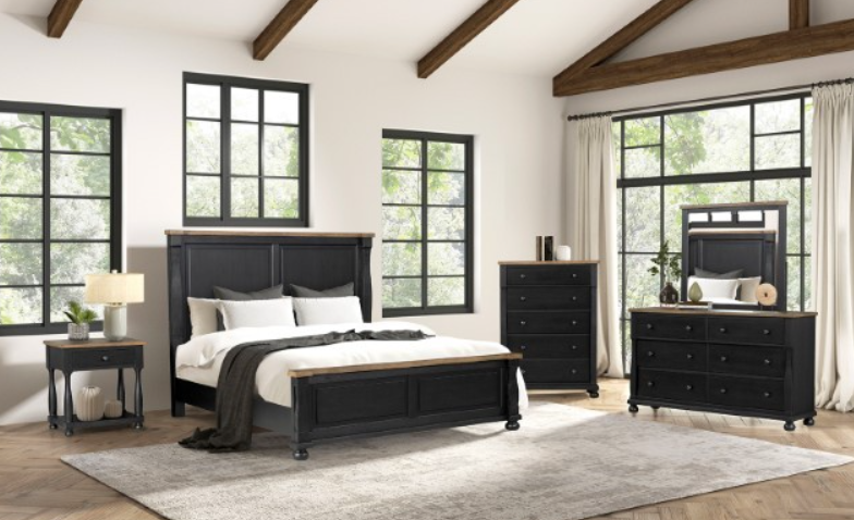 Blending the elements of contemporary design and rustic aesthetic, the Beechnut Collection is a unique addition to your master, youth or guest bedroom. Dark under-paneling serves to highlight the light finish of the embossed faux-wood veneer of the raised panels on the bed and case goods. Contrasting cup hardware punctuates each drawer front.