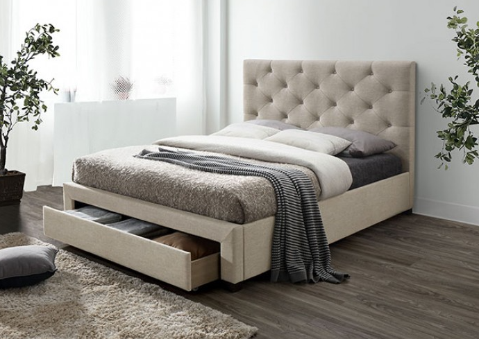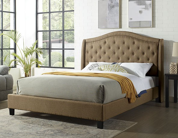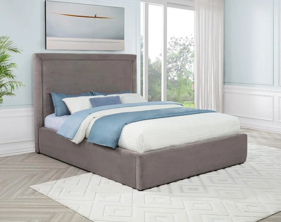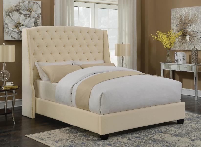 The stately profile of the Fairborn Collection will lend an air of understated elegance to your bedroom. The mansion headboard features nail head accent and button tufting creating a modern traditional look that defines your personal style. Providing additional function to the bed is the footboard which extends to expose drawer space to meet your additional storage needs. The bed is offered in one of three fabric coverings – Beige, Brown and Dark Gray.