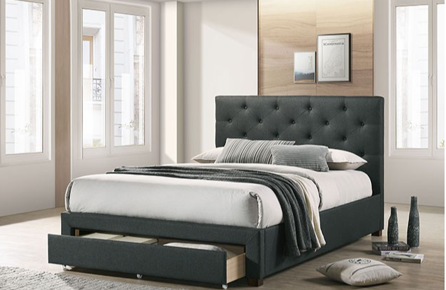 The stately profile of the Fairborn Collection will lend an air of understated elegance to your bedroom. The mansion headboard features nail head accent and button tufting creating a modern traditional look that defines your personal style. Providing additional function to the bed is the footboard which extends to expose drawer space to meet your additional storage needs. The bed is offered in one of three fabric coverings – Beige, Brown and Dark Gray