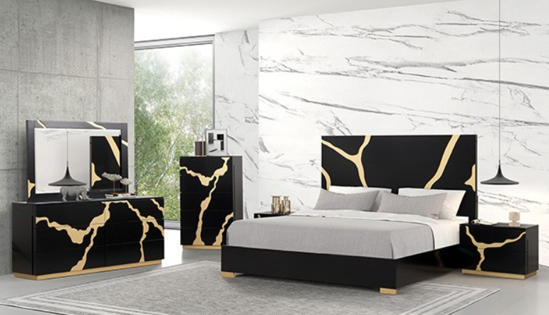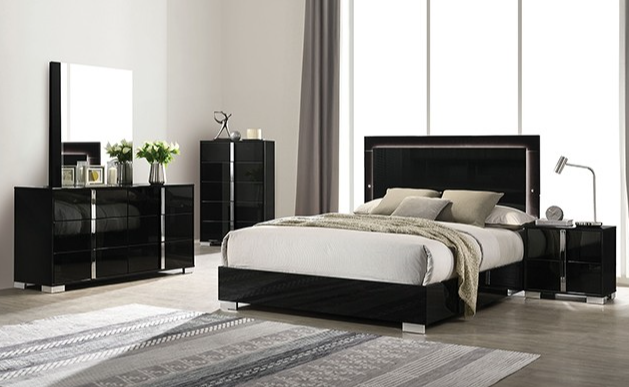 Glamour reigns in the design of the Allura Collection. Framing each piece is a decorative beveled mirror accent that enhances the illumination from the touch-engaged LED back-light of the headboard and mirror, as well as the under-light of the night stand. Alligator embossing and high polished crystal-enhanced hardware boldly accent the available silver or black finish of the collection.