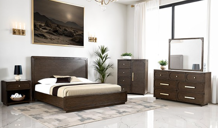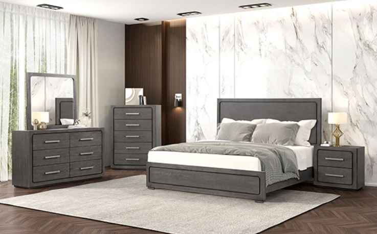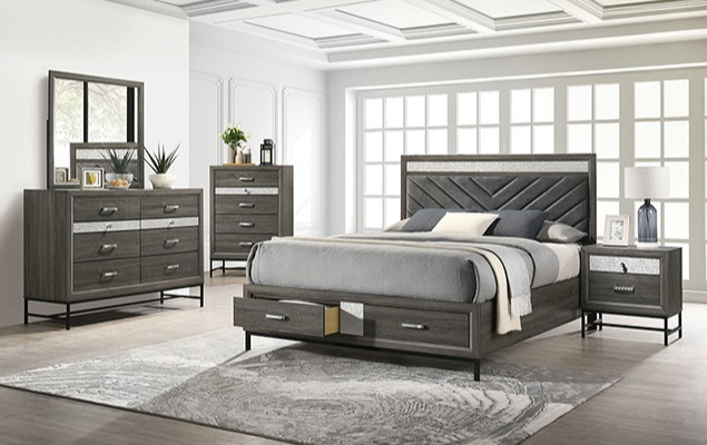 Elevate your bedroom with the Willowbrook Bedroom Collection, blending style and functionality. Featuring a bed with 6 total drawers, the collection includes a bed, dresser with mirror, chest and nightstand. Crafted from acacia wood and selected hardwoods with a sleek gray finish, the bed’s panel design adds a touch of modern sophistication. The dresser and nightstand offer ample storage with smooth-ball bearing glide drawers, perfect for organizing your essentials. This collection is ideal for anyone seeking a stylish and practical solution for their bedroom. Available in Queen, Eastern King and California King.