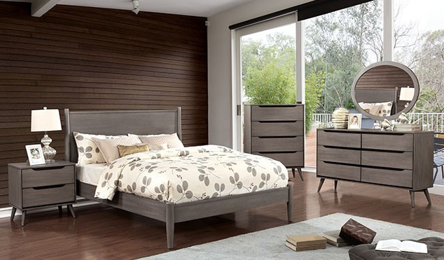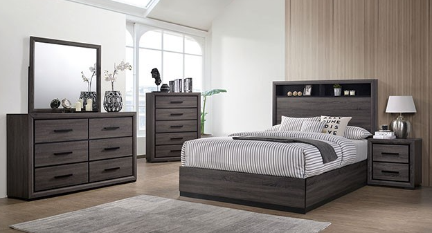Following the trend of rusticated simplicity is the Bridge Collection. Melamine laminate perfectly mimics the look of gray weathered wood, lending to the rustic style. The transitional framing of the collection allows for placement in myriad bedroom settings, creating the perfect canvas for your preferred decorative style. Black metal bar hardware fronts the drawers of the nightstand, dresser, mirror, chest and storage footboard, providing complementing contrast to the gray finish.