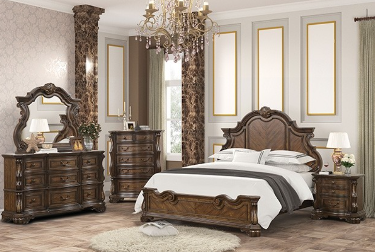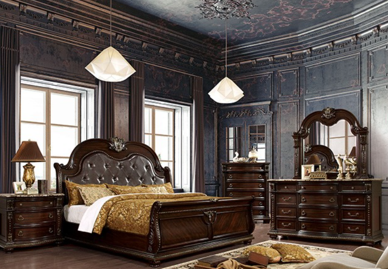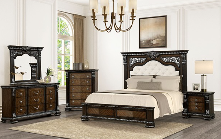Traditional, Dark Brown, Asian Hardwood, Oak Veneer, Engineered Wood, Bombay Headboard Design, Ornate Moldings & Extended Corbels, Diamond Button Tufting, Leatherette Headboard, French Front & English Back