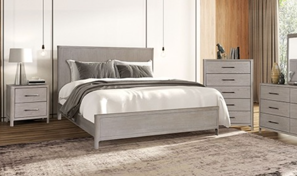 Modern lines and rustic styling are paired to create the look of the Corbin Collection. The 3D printed paper veneer’s texture is highlighted by a gray finish for a realistic wood look. Subtle framing defines the profile of the queen panel headboard and footboard, further lending to the unfettered design of the collection. The bed’s construction allows for convenient packaging within one box.