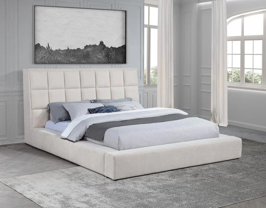 With a frame constructed from pine and plywood, this bed is upholstered in a beige fabric with button tufting on the headboard. A unique hydraulic lift reveals ample storage space underneath. Individually applied chrome nailhead trim finishes off the look of this queen bed. Lots of storage!