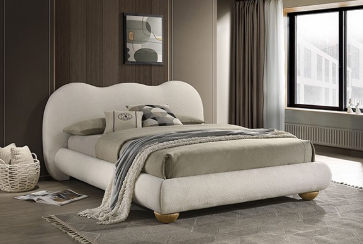 Contemporary, White/Natural Oak, Boucle Fabric, Solid Rubberwood, Engineered Wood, Camel-Back Shaped Headboard, Round Bun Wood Feet, Mattress Ready