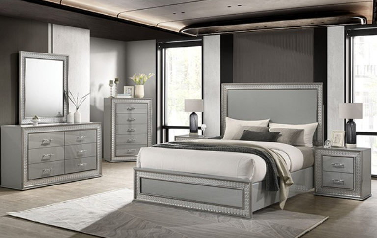 The unique styling of the Luster Collection presents a glamorous option for your bedroom. Embossed faux-wood veneer features a gray finish that allows for the acrylic silver glitter fronts of the hidden jewelry drawers to shine. The jewelry drawers feature felt lining to protect your hidden items from wear and tear. The panel headboard features acrylic silver glitter accent banding as well as a silver faux leather channel-padded insert. Polished chrome bar drawer pulls front the drawers providing complementing contrast to the collection’s finish.