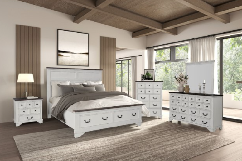 The Garretson Collection blends transitional lines with rustic styling to create an elegant addition for your bedroom. The queen bed features a white finish and metal bar hardware on the picture frame drawer fronts of the low-profile storage footboard, the two drawers creating additional space within your room for soft good storage.