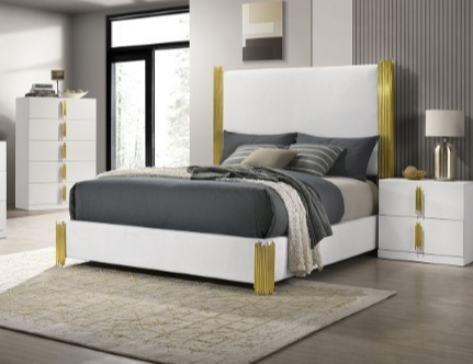 The unexpected intersection of traditional design and glamorous styling creates the dynamic look of the Lana Collection. A white finish is utilized to enhance the faux alligator embossed fronts of the Queen bed. The headboard features a faux leather crystal-tufted headboard as well as dramatic LED backlighting.