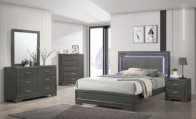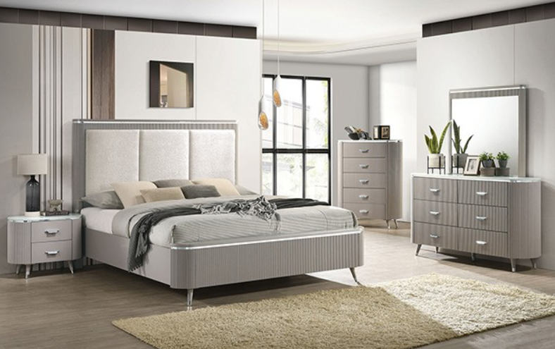 Designed to help your bedroom reach its full glamorous potential, the Tamsin Collection’s unique attributes blend to create a stylish and functional addition to your lifestyle. Mirrored framing provides dramatic enhancement to the queen bed, while LED back-lighting, from the vertical headboard panels, illuminates and highlights the embossed silver-gray finish of the collection. Acrylic bar hardware provides unobtrusive decorative touch to the drawer fronts of the storage footboard, with the faux leather-covered padded headboard insert lending decorative contrast to the finish of the collection.