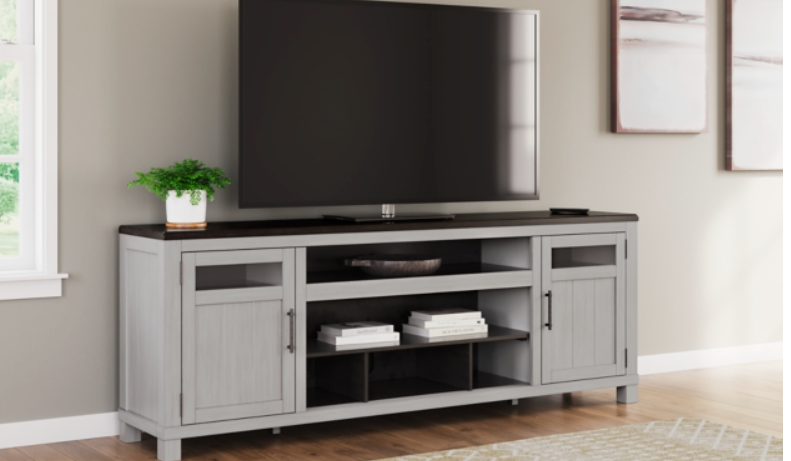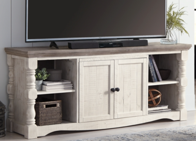 Set your sights on modern farmhouse style with this XL TV stand. Distressed two-tone treatment blends a weathered gray with vintage white for an utterly charming effect. Turned posts lend a hearty, substantial look that feels right at home, while plenty of open shelving makes the aesthetic anything but heavy.