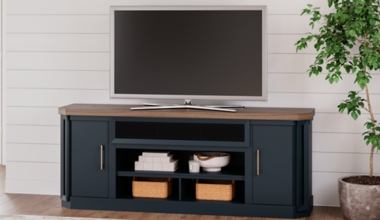 This TV stand combines casual contemporary design with modern appeal. Its combination of a thick-bodied wood-tone top with a slate blue cabinet is a smart choice on so many levels. Stow away electronics in the roomy cabinets, and use the upper shelf to conceal a soundbar speaker for a clean integrated look.