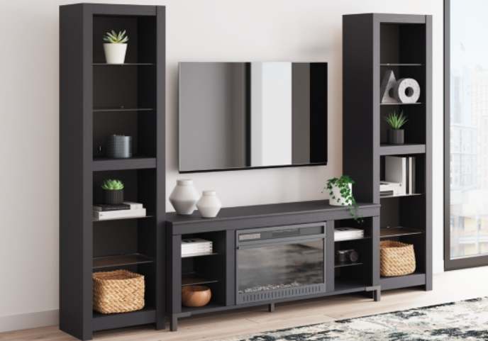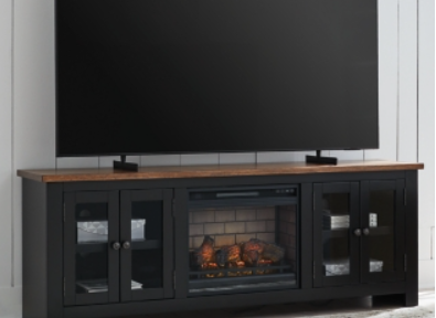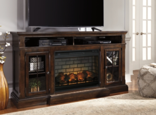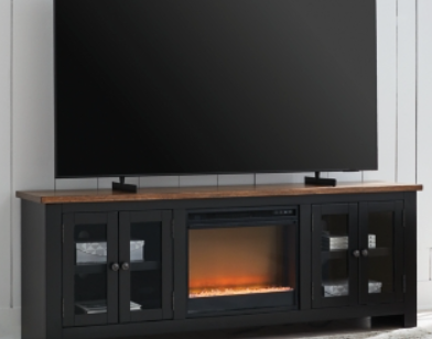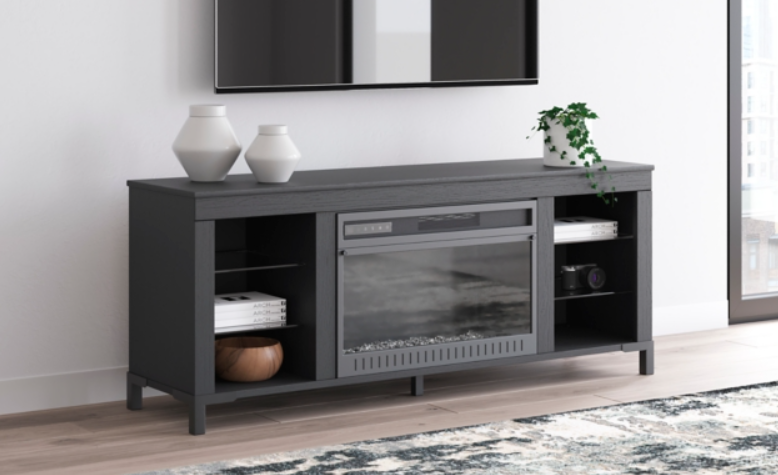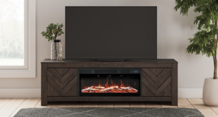 This TV stand with electric fireplace embraces a classically charming aesthetic and repurposes it for modern living. Its dark charcoal finish appeals to your love of vintage character. Media accessories stay tucked away in style thanks to hidden storage behind the doors. And for added ambiance, the electric fireplace brings a cozy-cool vibe to your living room. With the touch of a button, activate the LED-lit flame and adjust the temperature or the flame brightness. The flame effect includes multiple color options and a realistic-looking faux birch log set.