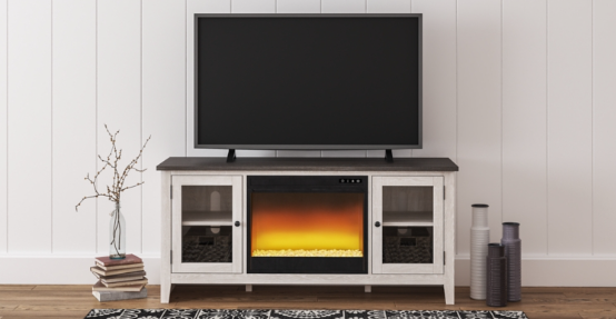 With its two-tone finish and minimalist charm, this TV stand with fireplace option is right in tune with your relaxed approach to high style. Beautifully made to accommodate your media equipment, it’s well equipped with adjustable shelving, cutouts for wire management and a pair of glass-front doors that enhance the clean-lined aesthetic.