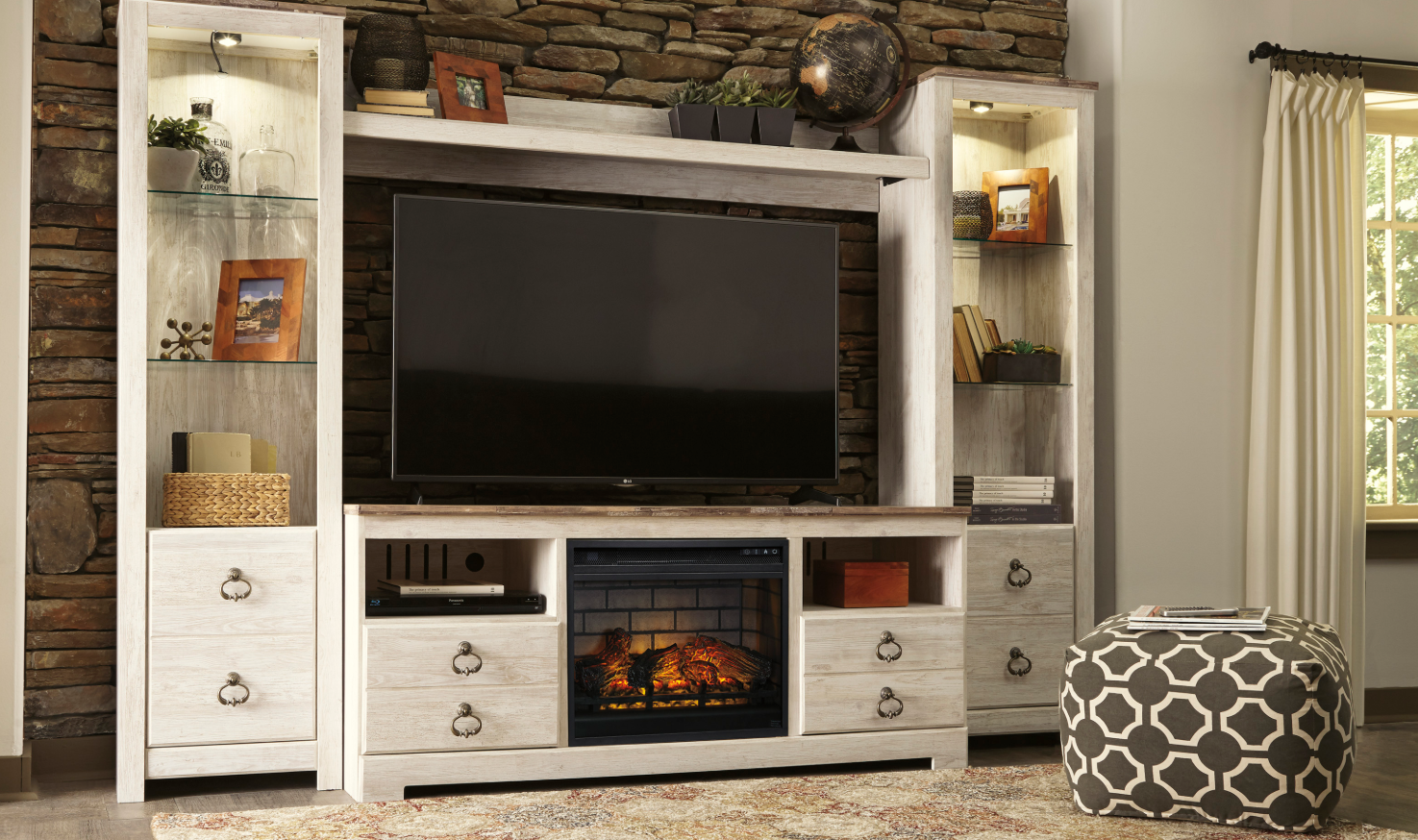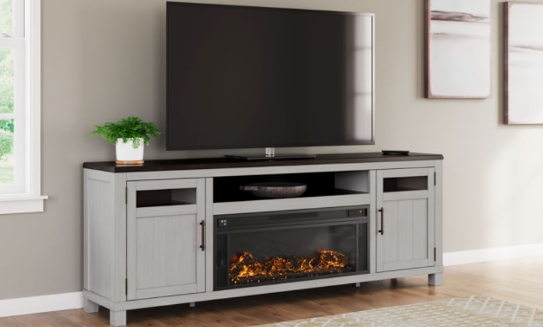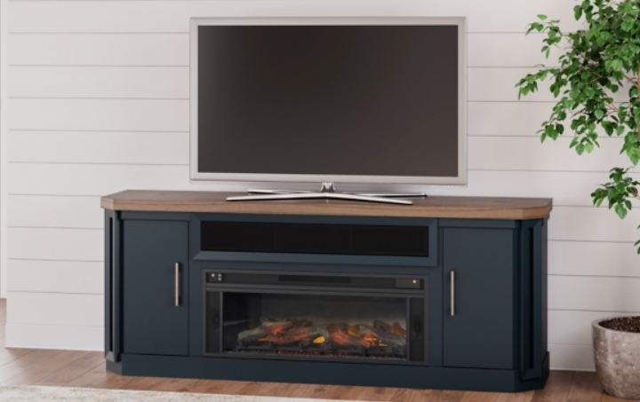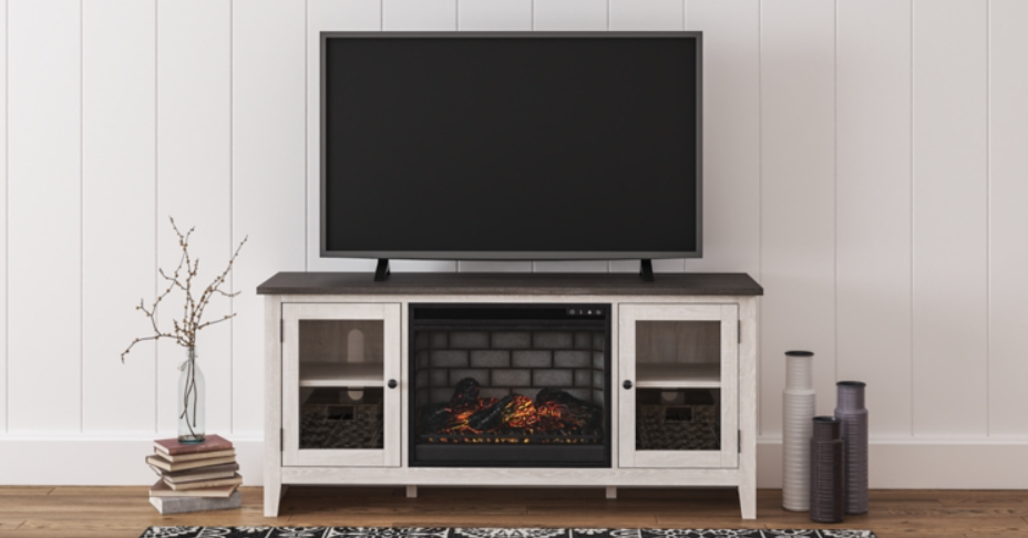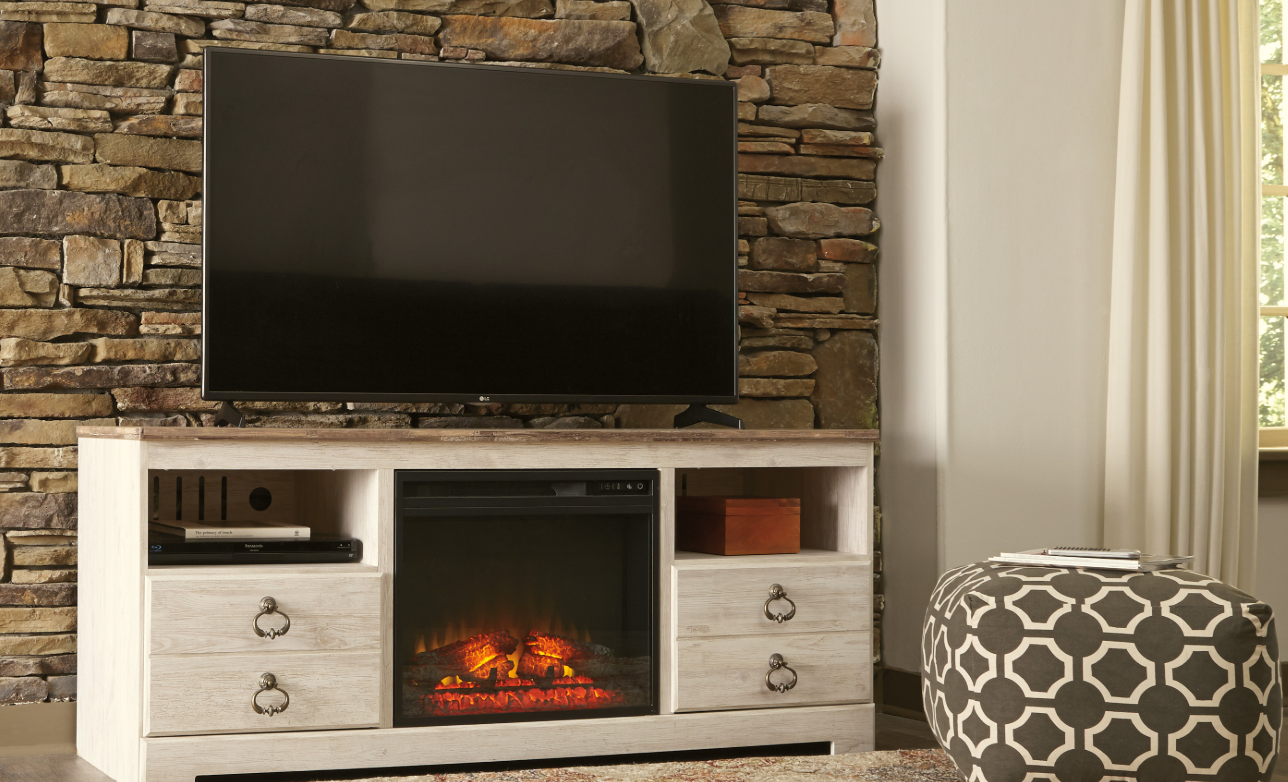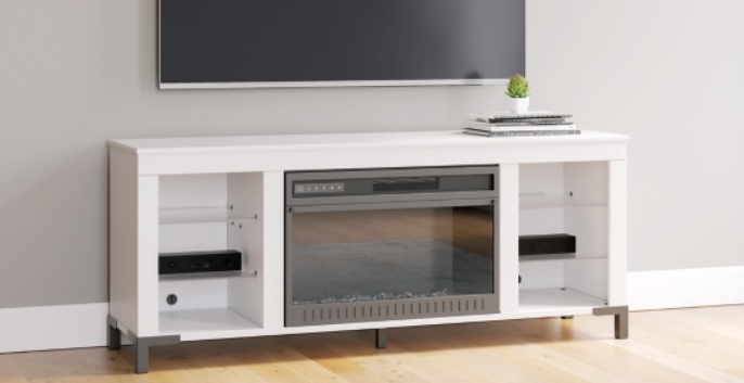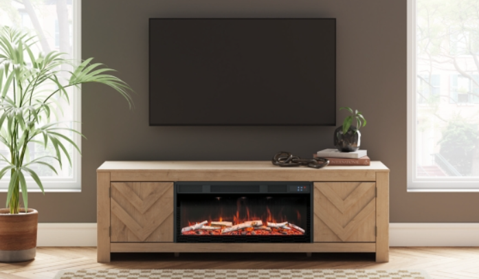 This TV stand with electric fireplace embraces a classically charming aesthetic and repurposes it for modern living. Its light replicated wood grain appeals to your love of vintage character, while the chic chevron pattern is effortlessly on trend. Media accessories stay tucked away in style with hidden storage behind the doors. And for added ambiance, the electric fireplace brings a cozy-cool vibe to your living room.