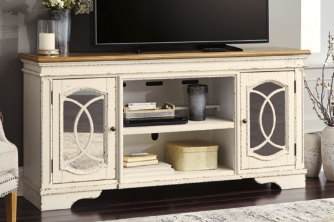 Whether your style is farmhouse fresh, shabby chic or country cottage, you’ll find this extra large TV stand perfectly in tune. Its two-tone, gently distressed finish pairs weathered oak with antiqued white for that much more quaint character. Charming elements include crossbuck adorned cabinets with glass inlays for peek-through flair. Ample adjustable shelving and cutouts for wire management nicely accommodate your media needs.