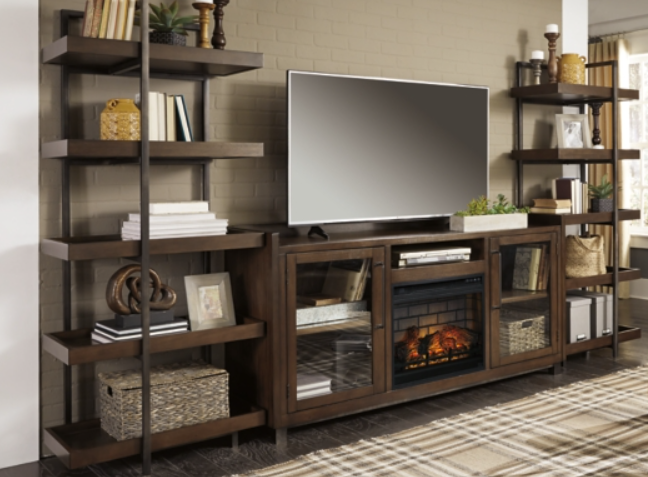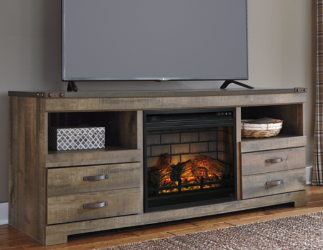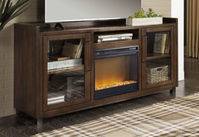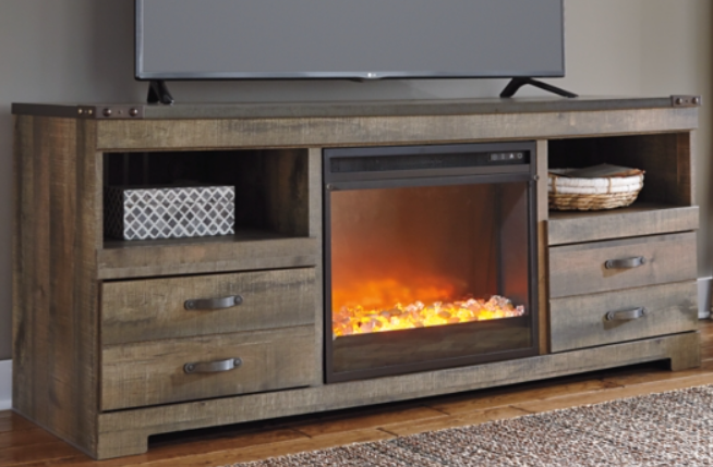Entertain a rugged yet refined sense of style with this TV stand with fireplace insert. Its rustic finish and plank-style details pay homage to reclaimed barn wood, while metal banding with nailhead accents infuses a touch of industrial cool. Ultra-clean lines ensure a look that can go from the country to the city and feel equally at home.