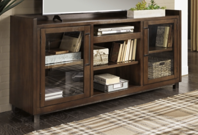 Made from solid hardwood with a veneer inlay top in warm brown, this TV console features two doors with glass panels, concealing two shelves inside. In the center, two more shelves are available for your devices, along with a bottom drawer for storage. This sturdy and supportive console can fit TVs up to 60 inches and 200 pounds.