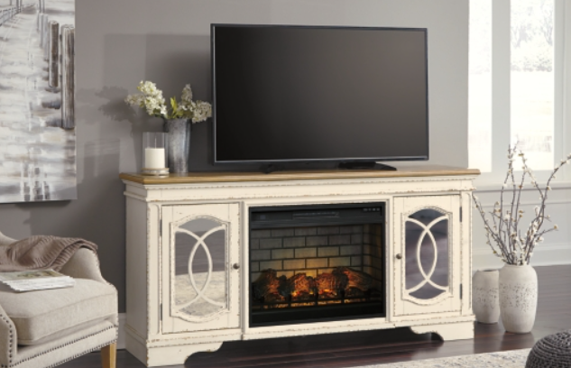 Elevating the art of traditional cottage styling, this TV stand with fireplace option is beautifully in tune with your taste. Antiqued two-tone aesthetic blends a chipped white with a distressed wood tone top for added charm. Cabinet doors’ decorative fretwork over mirrored glass adds a lovely twist. Compatible with W100-121 fireplace insert (sold separately).