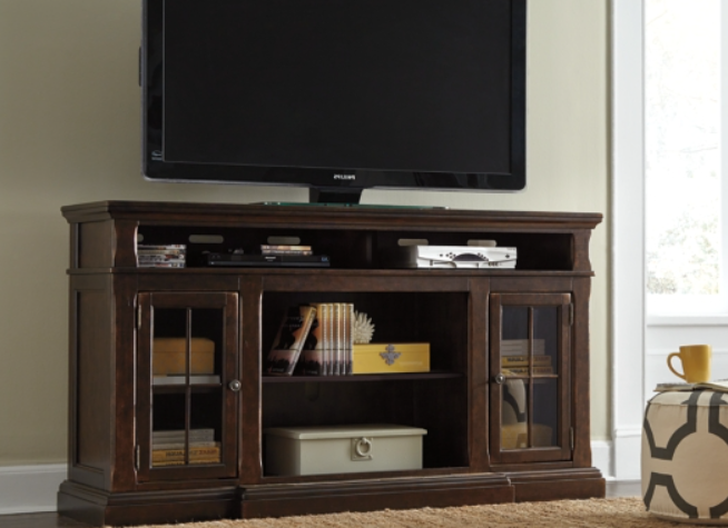 Organize your media space in style with this handsome merlot television console. Spacious interior shelves offer plenty of space to store your DVDs, game consoles, and essential everyday accessories. Glass doors help protect your sensitive electronics from dust or even pets.