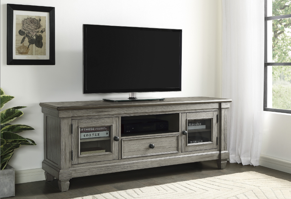 Inspired by the aesthetic of a casual country home and providing ample storage space for your media accessories is the 64-inch TV Stand of the Granby Collection. The two-tone look of the acacia and pine solids base, finished in antique gray, and the oak veneer of the unit’s coffee-finished top, present as a harmonious combination of color, perfect for your entertainment area.
