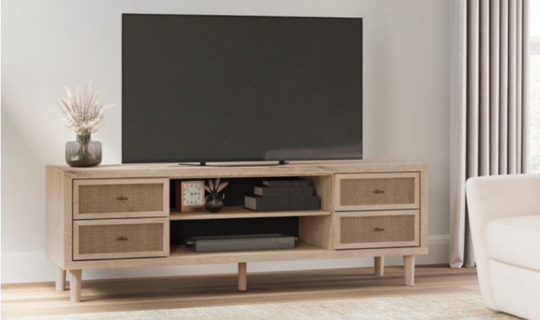 lean-lined and contemporary—but far from stark—this TV stand is a fresh style awakening. Pairing a light finish with replicated oak grain and textured beige cane details, its mixed materials bring a naturally versatile vibe to your favorite spot for binge-watching or gaming. Sleek, simple hardware plays perfectly with the modern aesthetic.