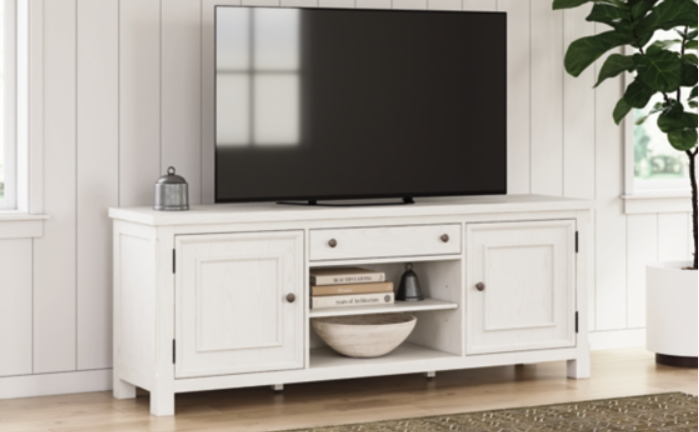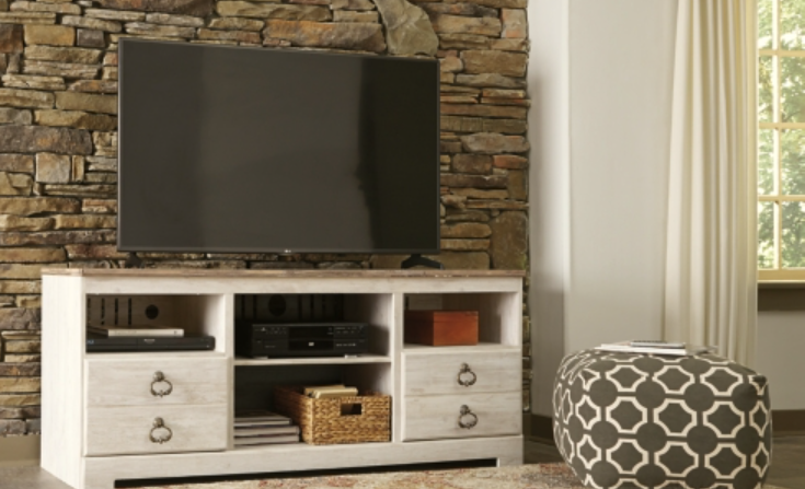 This TV stand is sure to impress when it’s time to relax after a tough day. With an antiqued white finish and wood grain texture, modern farmhouse-style design has never been so fashionable. Its cabinets and adjustable shelves are ideal for keeping all your equipment well organized and displaying your treasures. And that storage drawer is perfect for smaller accessories, bringing even more function to your entertainment space.
