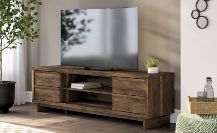 Nostalgic style, retooled for today’s trends. This TV stand puts an elevated twist on mod aesthetics. Its warm brown tones reflect the mid-century vibes you love, while the angular base incorporates contemporary motifs. Integrated drawer handles round out the look in sleek style. With this TV stand, you can build your living room into a modern haven with a touch of retro-cool flair.