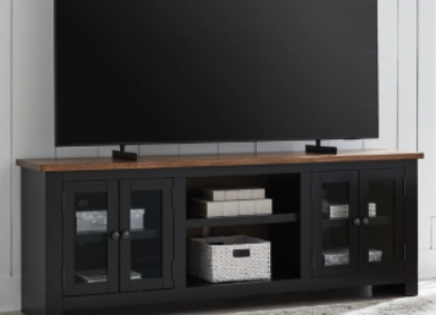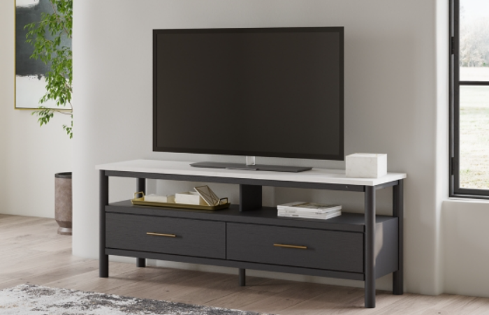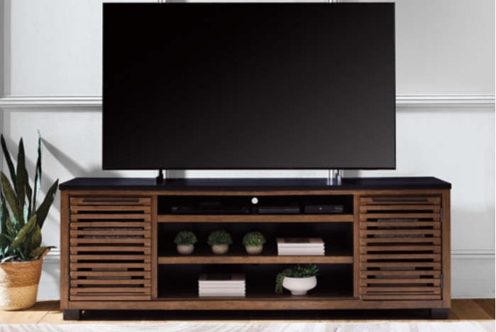 Double down on casual chic with the two-tone look of this TV stand. Its warm brown and matte black finishes reflect your eye for modern design. The trend-right slatted styling brings added charm. And with handy cabinets, shelving and cord management holes, keeping entertainment consoles and accessories organized is a breeze.