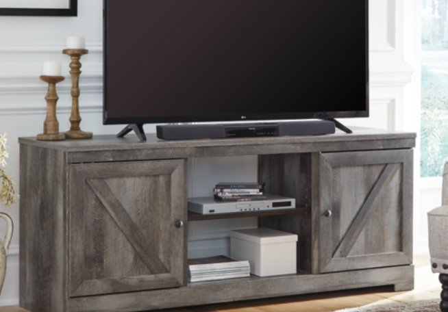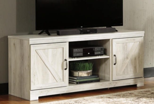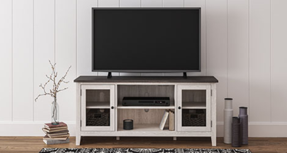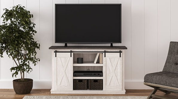 Make a farmhouse-inspired statement with this TV stand. It’s beautifully crafted to stand the test of time, with a planked effect and clean two-tone finish that lend a relaxing vintage feel. With two cabinets (each with an adjustable shelf) and an open cubby, it offers plenty of storage to house all of your electronic needs.