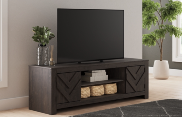 This TV stand embraces a classically charming aesthetic and repurposes it for modern living. Its dark charcoal finish to your love of vintage character, while the chic chevron pattern is effortlessly on trend. And with hidden storage behind the doors, your media accessories stay tucked away in style.