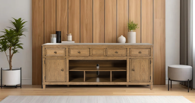 Taking a timeless approach to casual beauty, this TV stand brings easygoing elegance to the everyday. The light brown wood-tone finish seamlessly slips into your room’s aesthetic. Two spacious cabinets (each with an adjustable shelf), four drawers and an open center shelf offer plenty of storage for media and electronics.