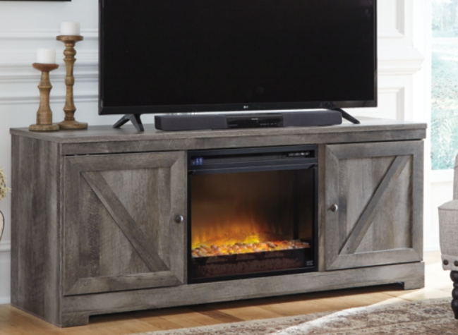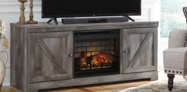 This TV stand with fireplace option is sure to win your heart with its daring designer take on modern rustic. The stand’s crisp, clean and minimalist-chic profile is enriched with a striking replicated oak grain with thick plank styling and a weathered gray finish for that much more authentic character. Crossbuck detailing adds a brilliant barn door inspired touch. Compatible with W100-101 and W100-02 electric fireplace inserts, sold separately.