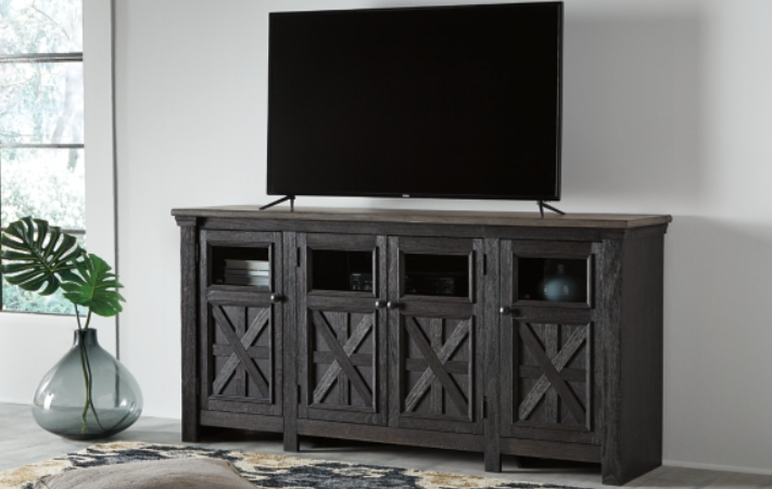 Shabby chic with a hint of down-home country, this TV stand appeals to today’s more relaxed sensibilities. Its richly rustic two-tone effect blends a textured black finish with a weathered gray-brown top for an easy-elegant aesthetic. Framed doors with crossbuck detailing and clear glass insets bring a touch of modern farmhouse to the scene.