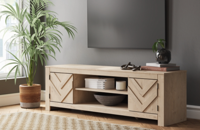 This TV stand embraces a classically charming aesthetic and repurposes it for modern living. Its light replicated wood grain appeals to your love of vintage character, while the chic chevron pattern is effortlessly on trend. And with hidden storage behind the doors, your media accessories stay tucked away in style.