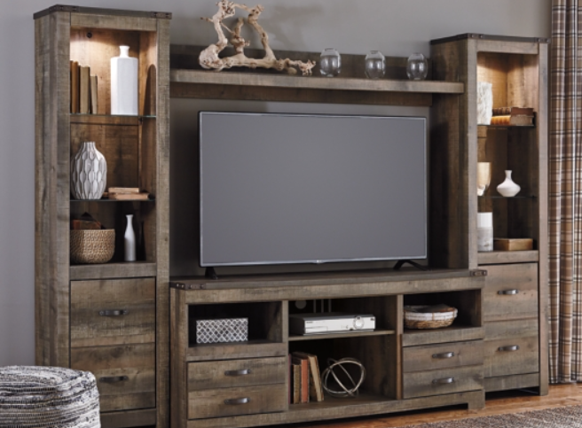 Entertain a rugged yet refined sense of style with this 4-piece entertainment center. Its rustic finish and plank-style details pay homage to reclaimed barn wood, while metal banding with nailhead accents infuses a touch of industrial cool. Ultra-clean lines ensure a look that can go from the country to the city and feel equally at home.