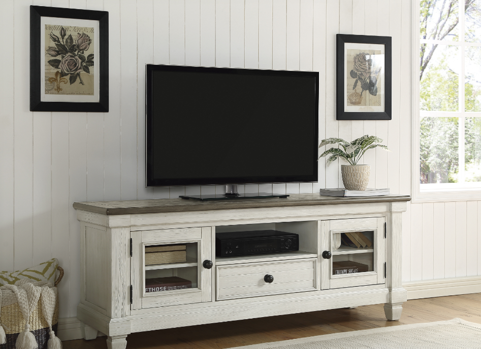 Inspired by the aesthetic of a casual country home and providing ample storage space for your media accessories is the 64-inch TV Stand of the Granby Collection. The two-tone look of the acacia and pine solids base, finished in antique white, and the oak veneer of the unit’s top, finished in a rosy brown, present as a harmonious combination of color, perfect for your entertainment area.