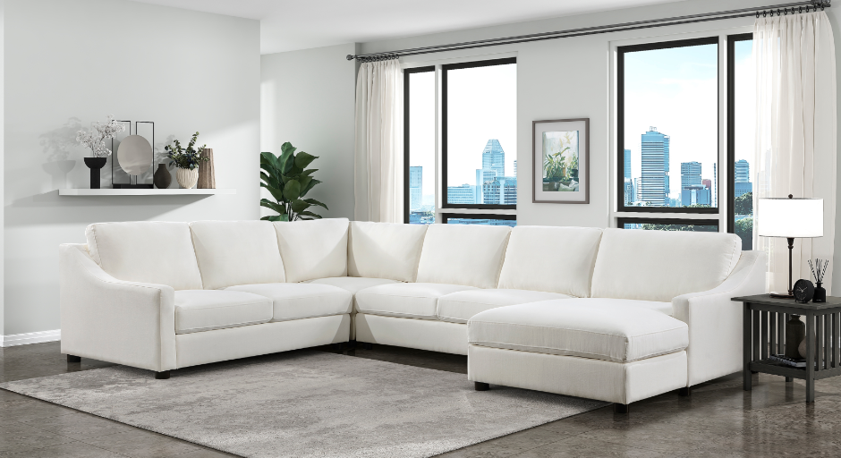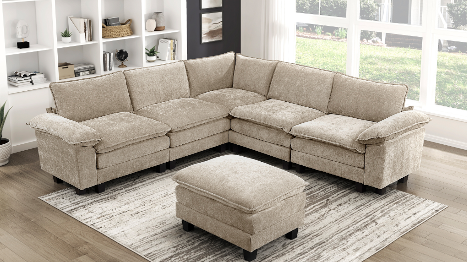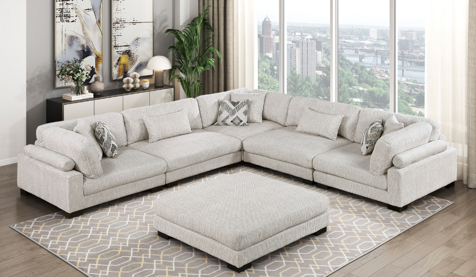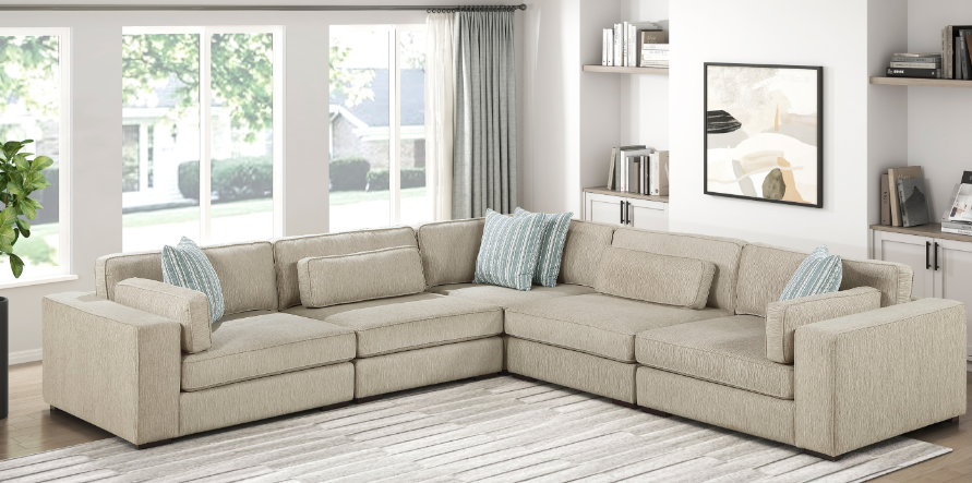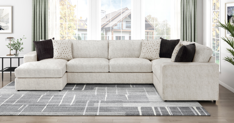 Transform your living room into a hub of comfort and style with our spacious U-shaped sectional. Upholstered in a soft, textured beige microfiber, this sectional is designed for family-friendly living with its durable solid wood and plywood frame. The plush, high-density foam cushions offer a supportive seating experience, while reversible cushions and removable, zippered covers make maintenance simple.