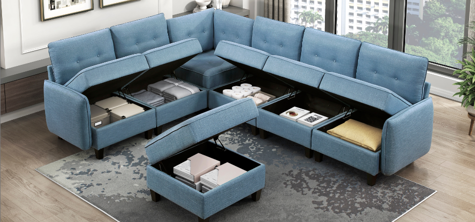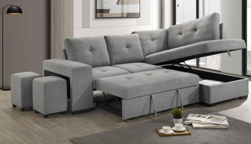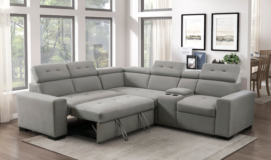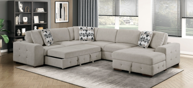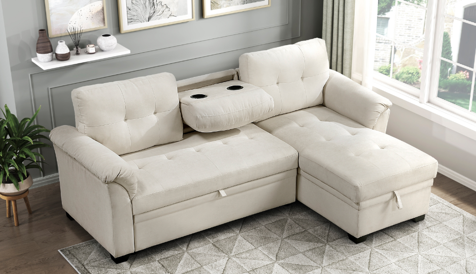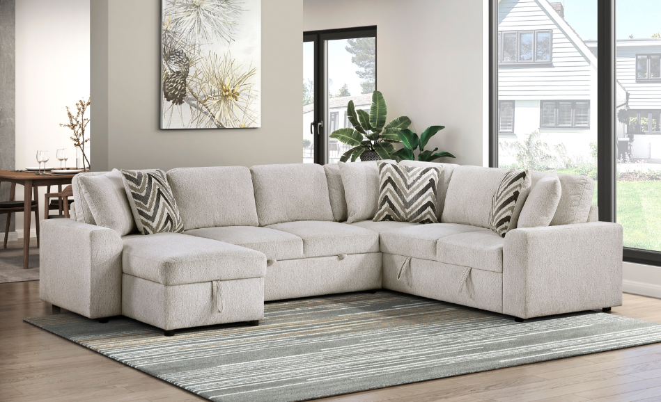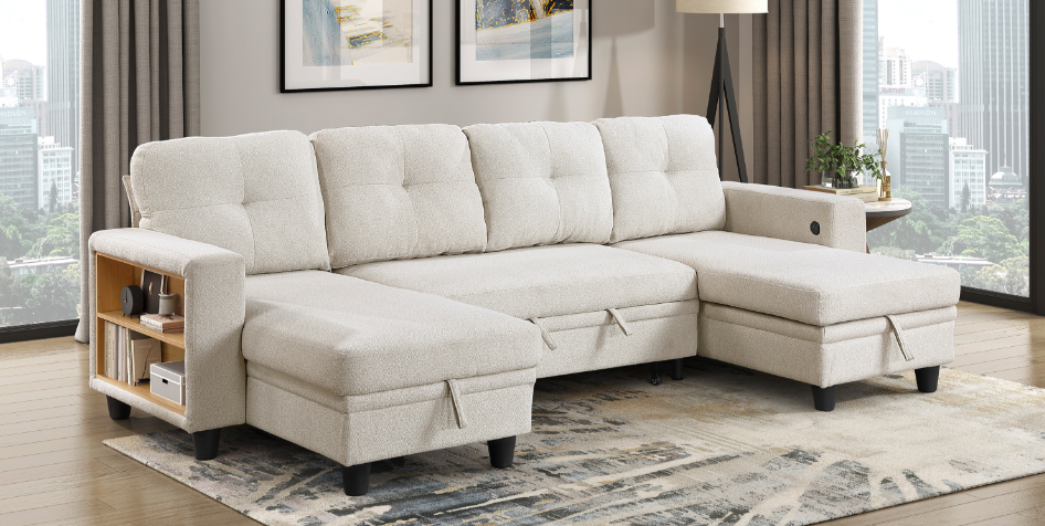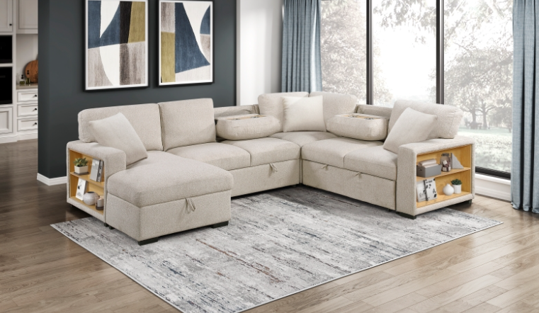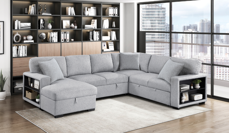 This versatile and stylish collection includes a convertible loveseat, sectional sofa, and U-shaped sectional, designed to maximize living space with both comfort and functionality. Each piece seamlessly transitions from a cozy seating area to a convenient pull-out bed, perfect for accommodating overnight guests. The furniture features integrated side shelves for storage and display, as well as built-in USB charging ports for easy device charging.