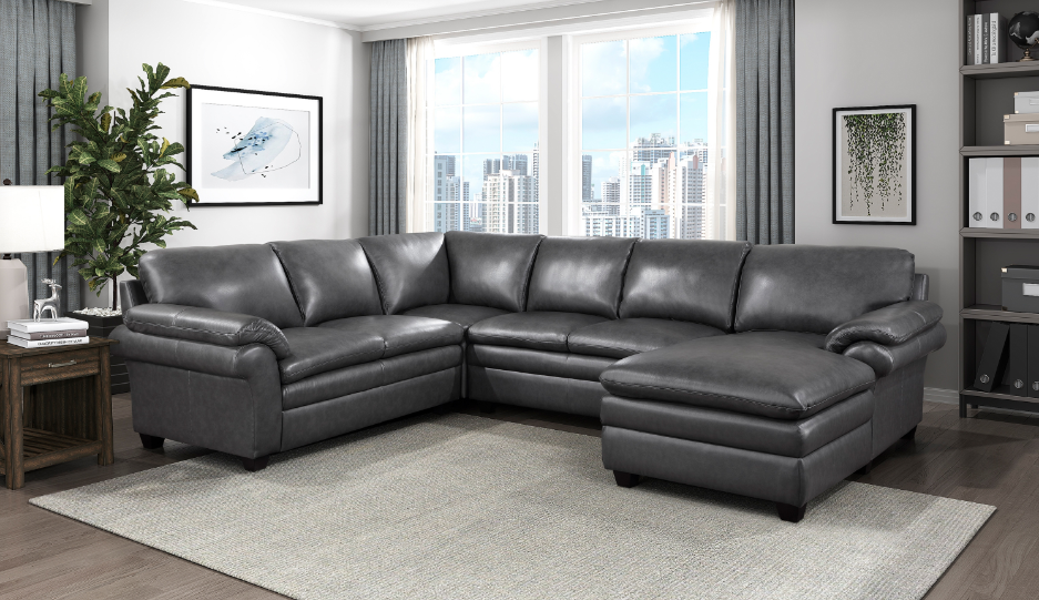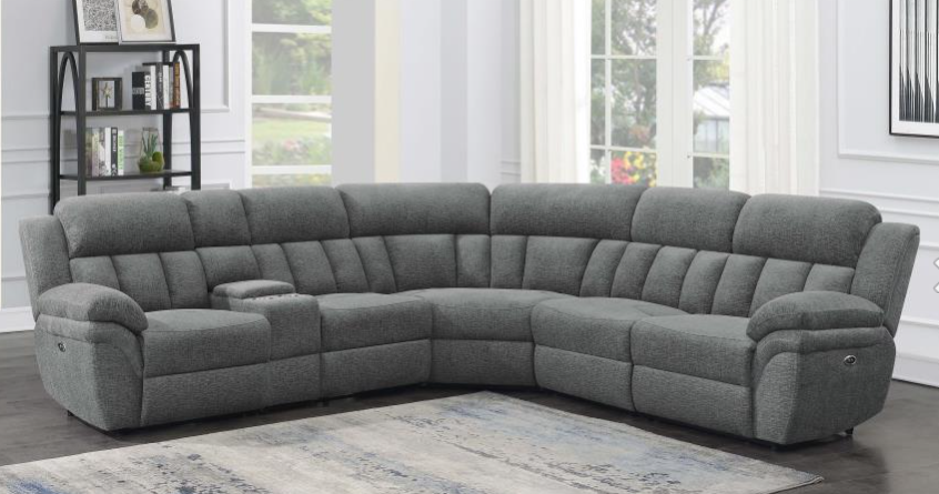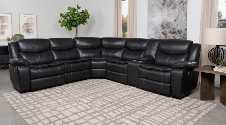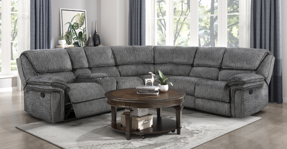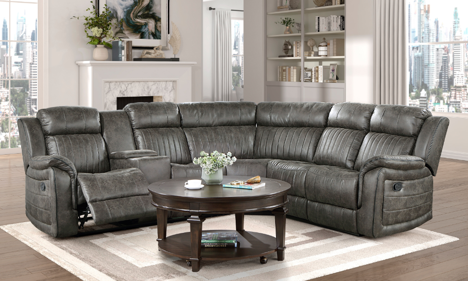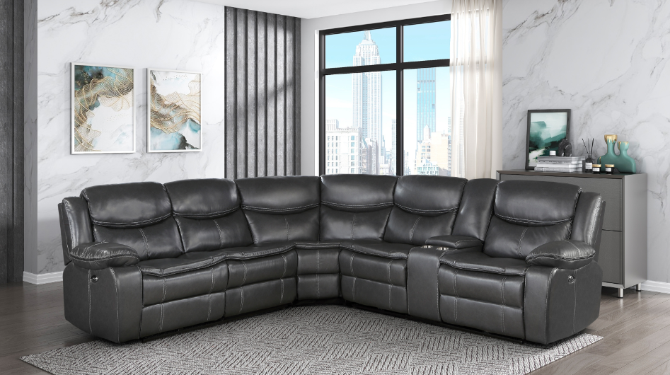 Designed to provide ample seating in your casual living room, the Fargo Collection utilizes a blend of comfort and function to create a perfect spot to chill out. The center seating unit is flanked by the dual power reclining seats of the right-side unit - its center console featuring cupholders, hidden storage, USB ports, and receptacles – and the left-side love seat with an end power recliner and stationary seat. Dark gray breathable faux leather covers the plush seating of the sectional.