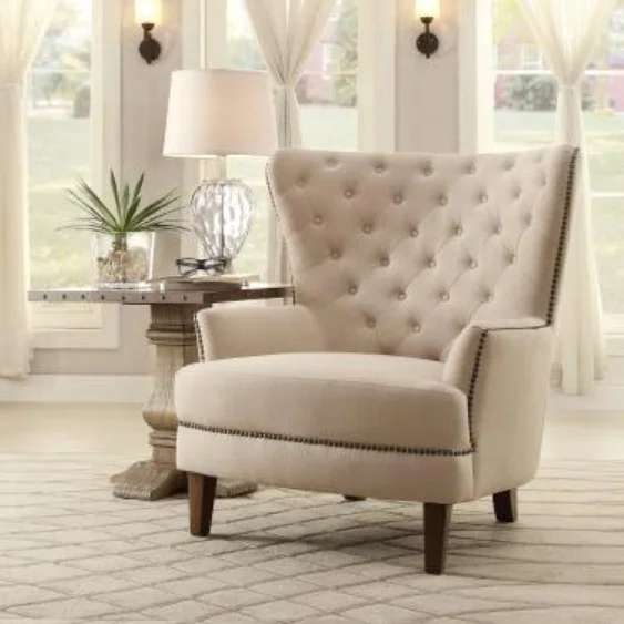 Add structure with the high back and rolled arms from the loveseat and sofa. In a soft beige fabric upholstery, the fine details exude class with crisp and tailored features. Elegant button tufting along the seat and back look great on the classic silhouette. Rounded front legs in a warm brown hue add interesting contrast that helps draw attention to the stylish nail head trim.
