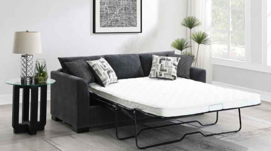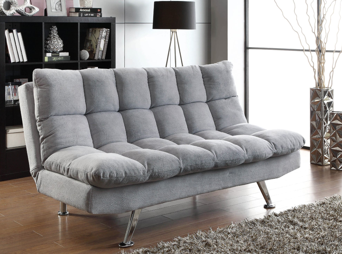 This piece is upholstered in a grey velvet fabric for ultimate luxury, with electroplated chrome metal sled legs to complete the look. This versatile piece of furniture easily converts from a sofa to a chaise to a queen sized bed. Two accent pillows are also included in this piece for a cozy place to lay your head.