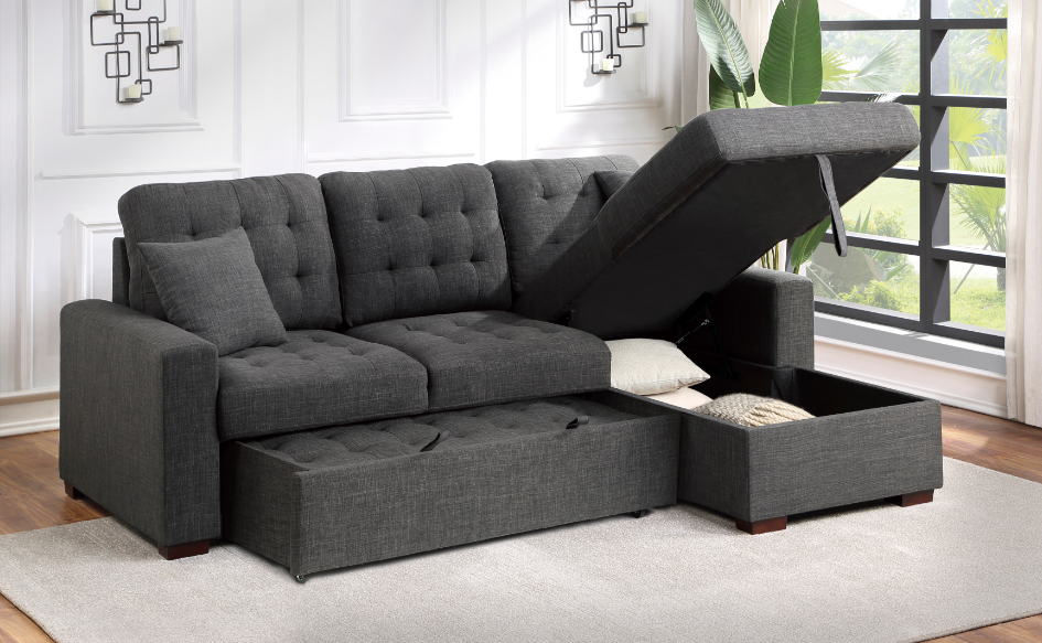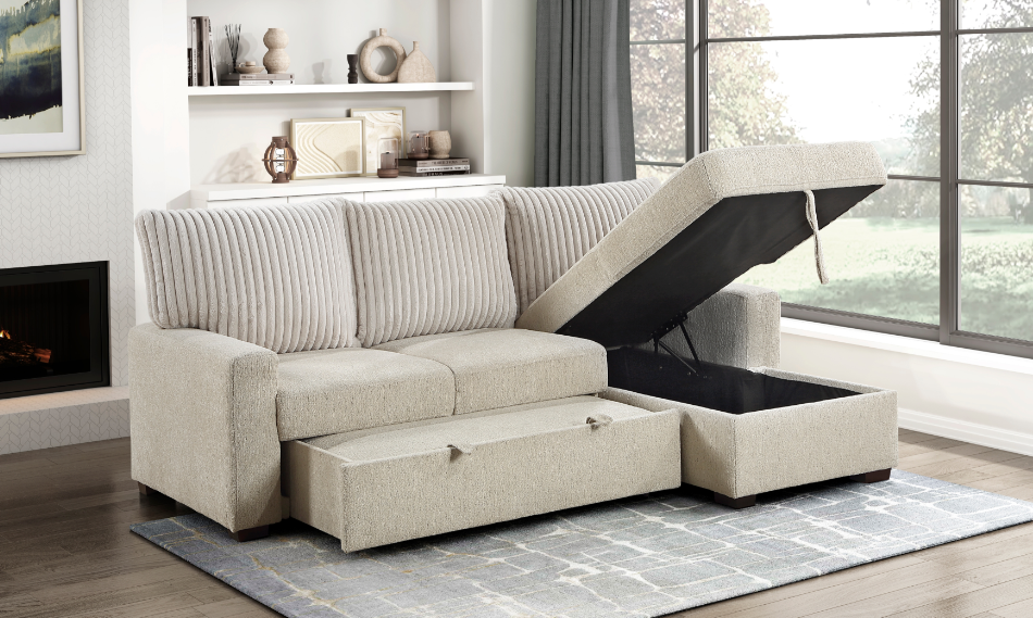 Providing a flexible option for relaxation, sleep and storage, the Ferriday Collection will be a stylish and functional addition to your living room. Under seat storage is revealed with the pull of a tab on the end chaise while the lower portion of the seating configuration pulls out to reveal a pop-up trundle that creates a bed space creating a relaxing environment with minimal effort.