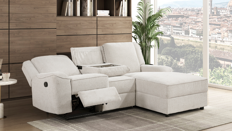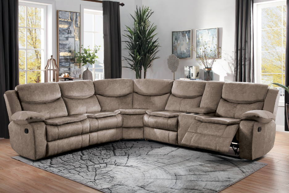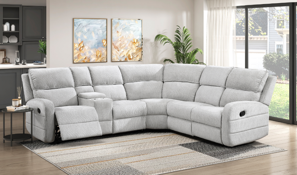 Sink into ultimate comfort and style with the reclining sectional with console, a three-piece centerpiece designed for luxurious lounging and effortless entertaining in your living space. This expansive sectional features plush chenille fabric upholstery that invites relaxation, while the manual reclining mechanisms on both ends allow you to effortlessly find your perfect angle for unwinding after a long day.