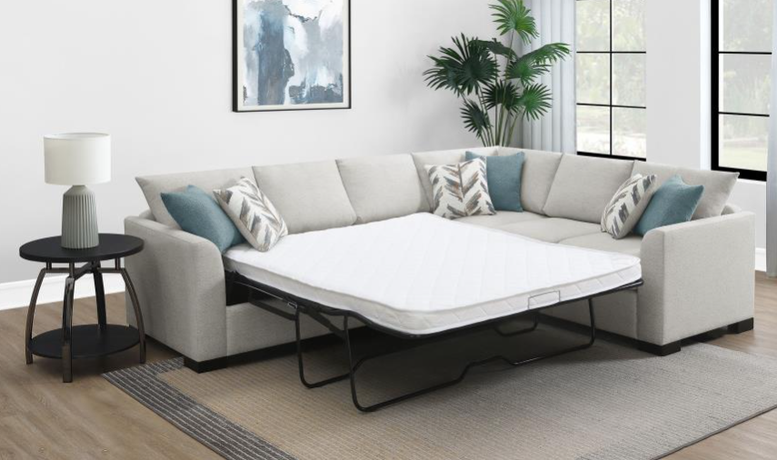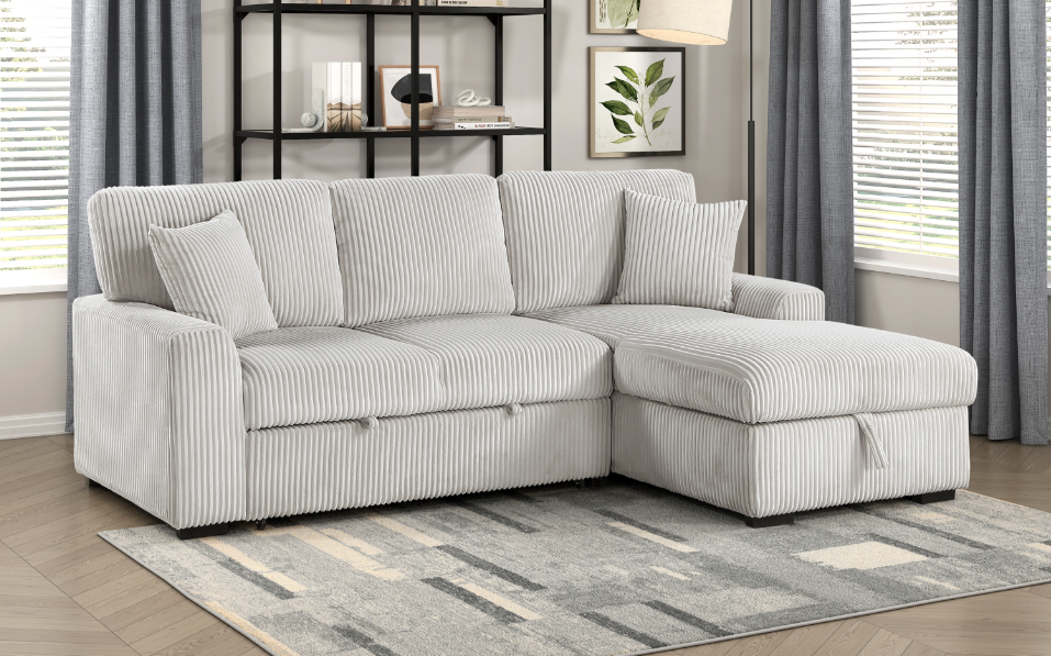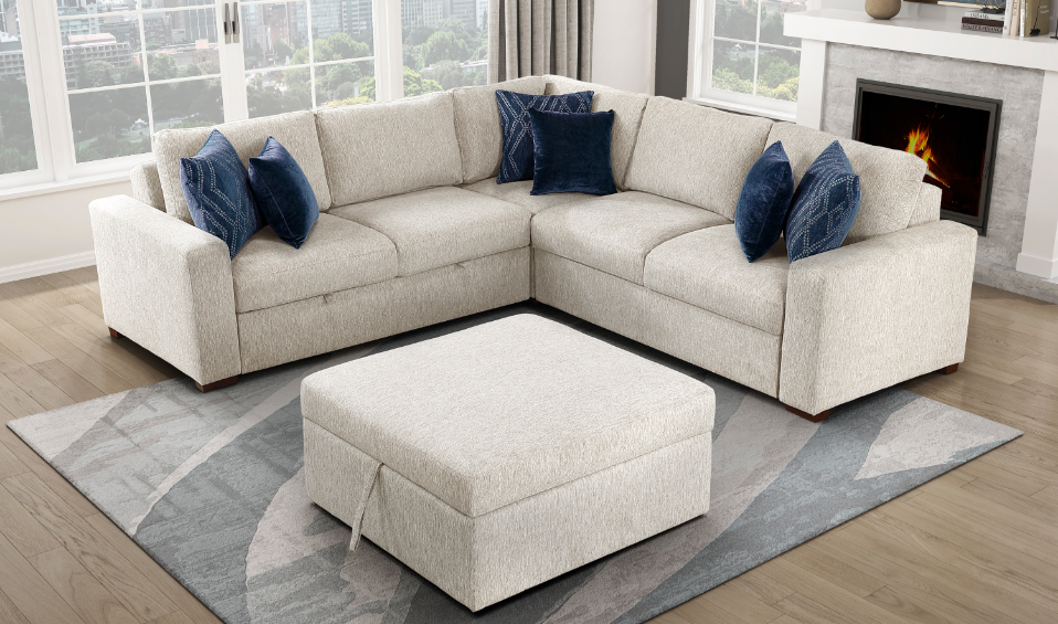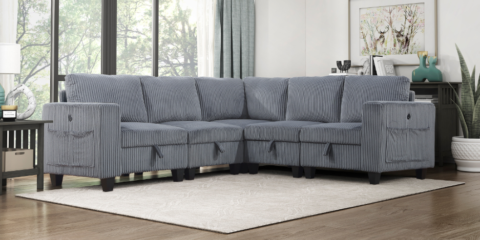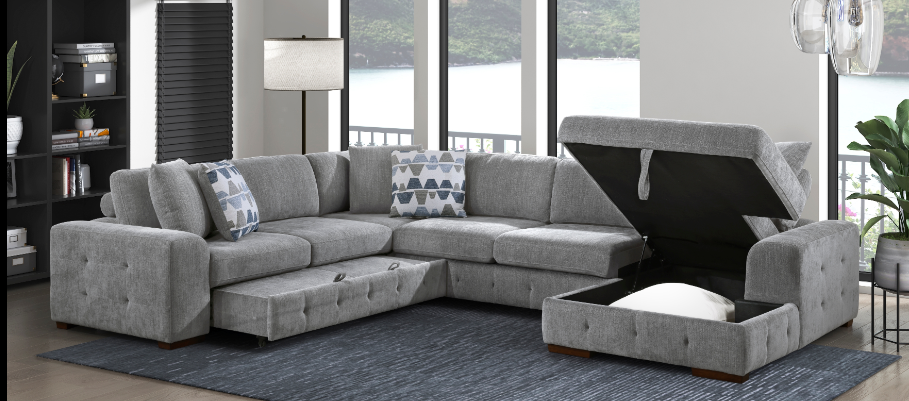 Providing a casual look and plentiful functionality to your living room is the Pompano Collection. The pull-out bed that is stored beneath the right-side two-seat unit, pops up to create ample space for full leg extension while the lift-top seat of the left-side chaise opens to reveal hidden storage perfect for blankets and pillows. Additional functionality comes in the form of the side mounted shelving units located within the outer face of the side arms and the USB charging ports.