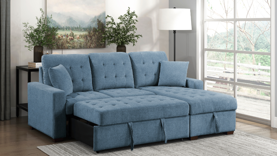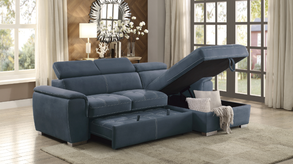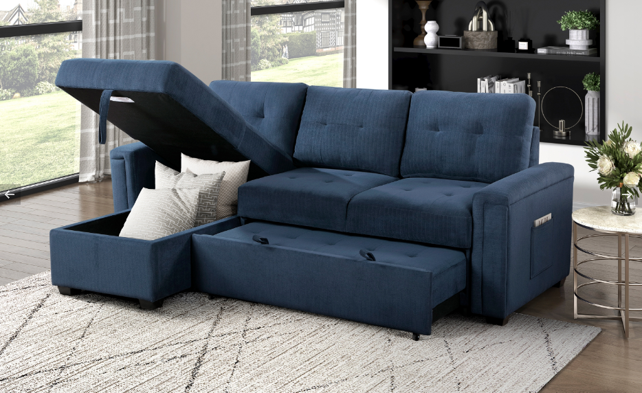 Maximize your living space with this reversible sectional sofa with hidden storage and pull-out bed, perfect for modern homes that value style and functionality. Upholstered in a rich navy blue fabric, this versatile sectional combines the elegance of a sofa with the convenience of a sleeper. Ideal for small apartments, guest rooms, or multifunctional living areas, this sectional is designed to provide comfort, style, and storage in one compact package.