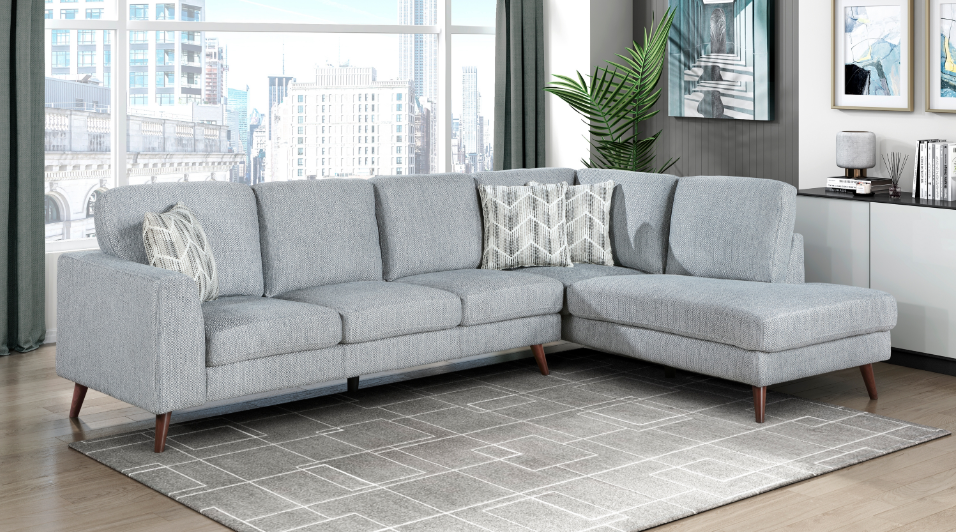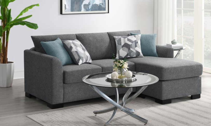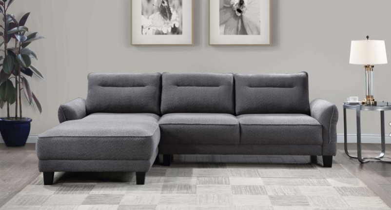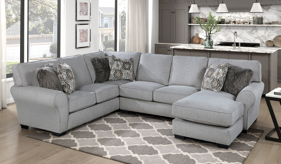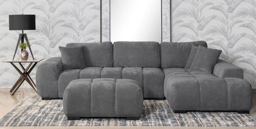 The transitional profile of the Kieran Collection is paired with a hint of modern flair to create a unique addition to your home’s living room. Gray chenille upholstery covers the sectional with both neutral patterned fabric, and graphite-hued faux fur accent toss pillows, adding a touch of whimsy. The corner sofa segment pairs with a three-seat sofa chaise to create the ample seating arrangement of the Kieran Collection.