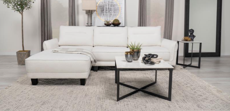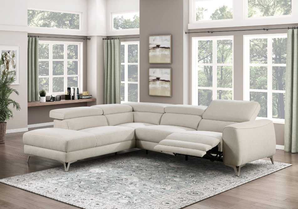 Modern elegance is exuded in the design of the Bienvenue Collection. Streamlined to exemplify minimalistic sophistication, the sectional features adjusted headrests and power end recliner. The open-ended chaise of the seating group allows for a fully extended relaxation. Beige textured fabric covers the collection while metal legs with a smoke chrome finish provide support.