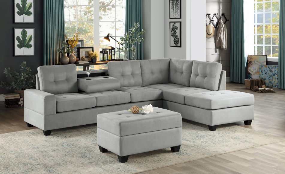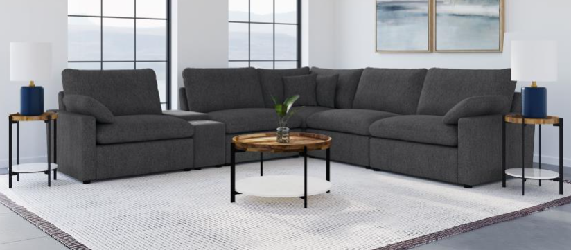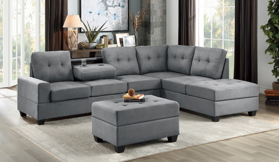 With a versatile style that is perfect for your casual living room, the Muirfield Collection’s plush seating and modern aesthetic create a platform for your relaxation. The plush pillow-top arms and seating of the sectional is covered in gray textured microfiber for neutral accent to your home’s decor. The left side seating of the sectional features a center console, its cupholders and hidden storage providing functional convenience to the group.